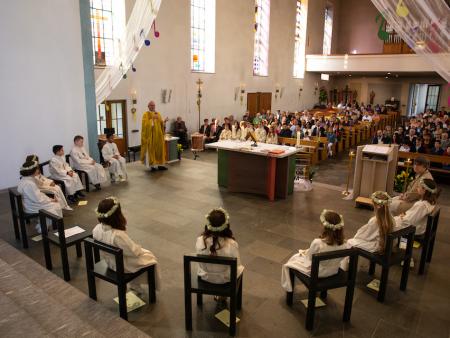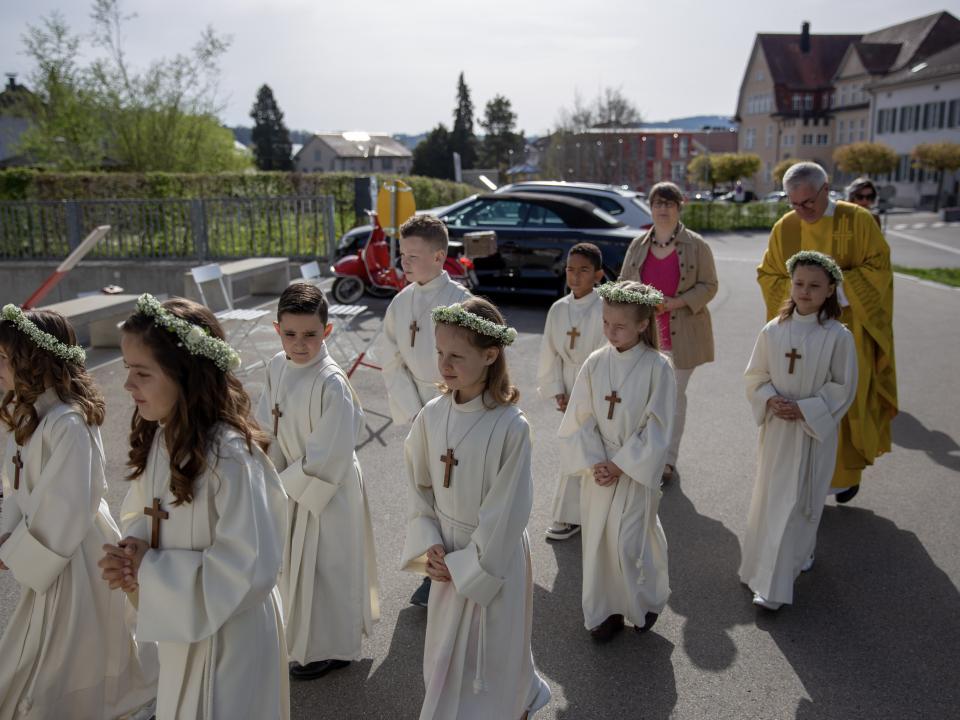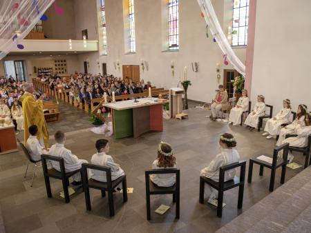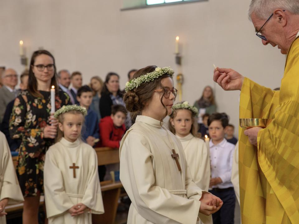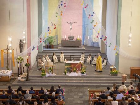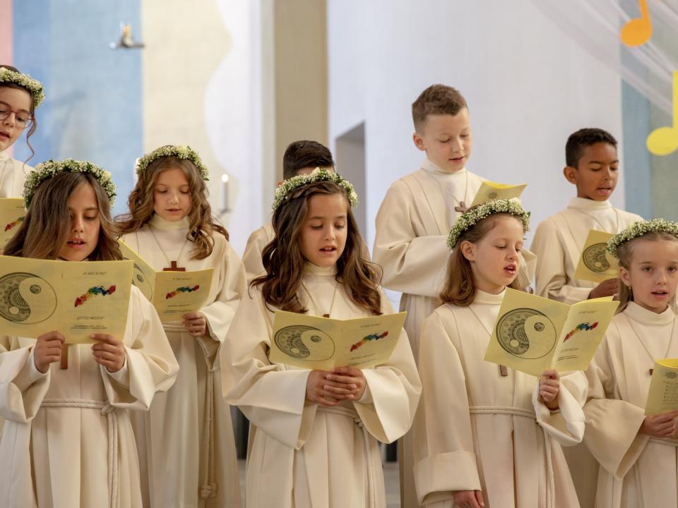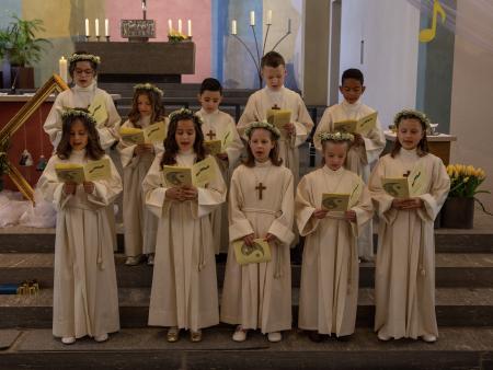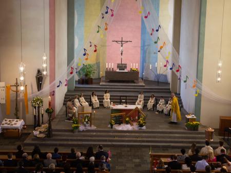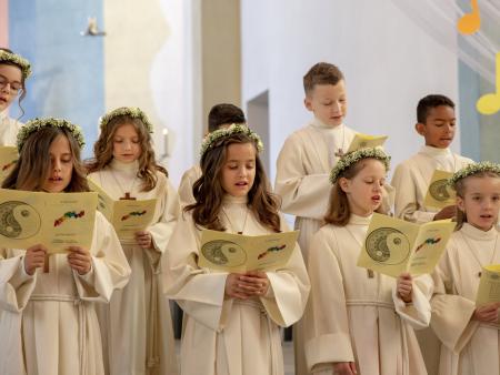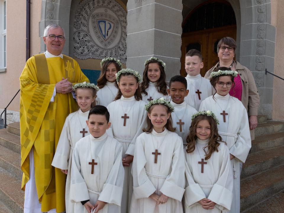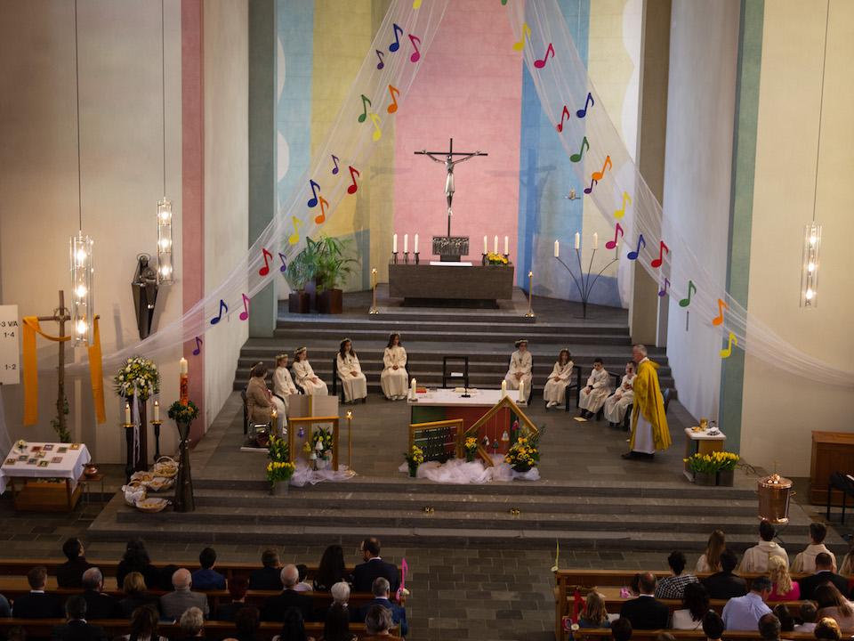 Nach intensiver Vorbereitungszeit durften am Ostermontag 10 Kinder aus unserer Pfarrei den grossen Tag ihrer Erstkommunion feiern. Begleitet von der Musikgesellschaft Aadorf zogen sie, zusammen mit Pfarrer Daniel Bachmann und ihrer Katechetin Claudia Wick in die wunderschön - zum Thema «In uns klingt Gottes Melodie» - geschmückte Kirche ein. Mit den voller Inbrunst gesungen Liedern machten die Erstkommunikanten dem Motto alle Ehre. Den Kindern ist zu wünschen, dass mit dem Empfang der Kommunion auf ihrem Lebenswegen Gottes Melodie weiterhin in ihren Herzen erklingen wird.